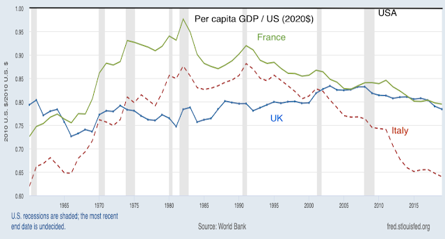 Here are the 2019 numbers (in 2019 dollars, again World Bank) US: $65,297. UK $42,330. That's 35% less than the US. Or, the US is 54% better off than the UK.. France: $40,494. Italy: $33,228 That's 50% less than US. Or the US is 96% better off than Italy. China: $20,261.