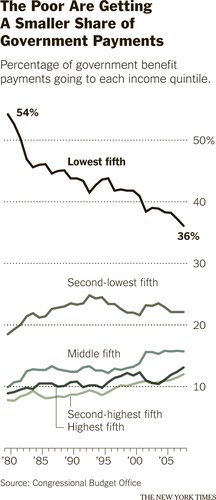 I see that the "entitlement" category on the NYT graph includes some government spending focusing on the poor (such as food stamps, and, I assume, Medicaid). I also notice that the graph explaining the distribution of government payments ends around what looks like 2008, before the recession really took a toll on government finances.