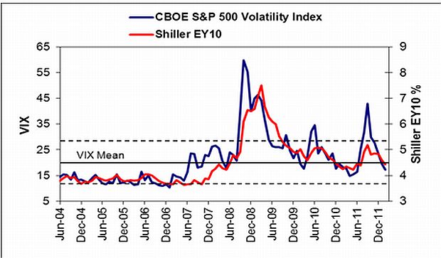 It shows a nice correlation between the VIX and the earnings/price ratio. In turn, the earnings/price ratio is one of the best return forecsaters. So, conditional mean and conditional variance of returns do move together.
