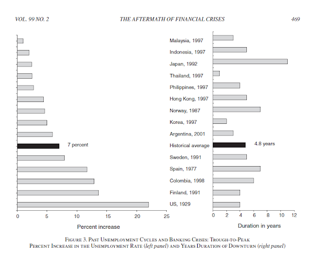 the aftermath of banking crises is associated with profound declines in output and employment... The unemployment rate rises an average of 7 percentage points over the down phase of the cycle, which lasts on average over four years.(The paper doesn't offer a comparison with "regular" business cycles, but I presume they have one somewhere.) In a recent Bloomberg oped, Reinhart and Rogoff repeat that summarizing all their evidence, they think recessions following financial crises are longer and deeper.