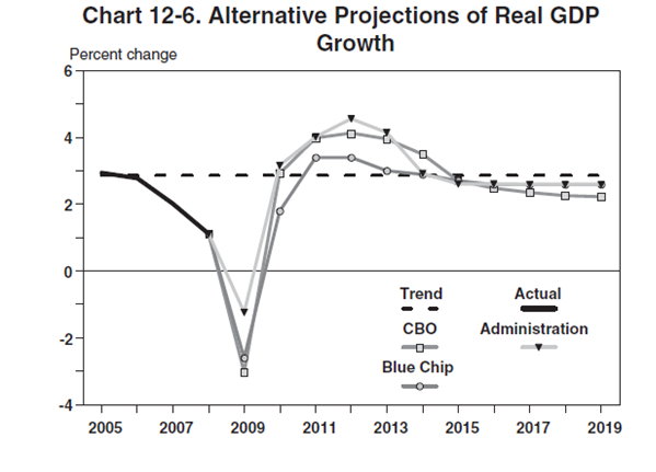 But you're missing the point. Let's not regard lack of clairvoyance as "effed up". Let's use these forecasts to see what people were thinking at the time. They were thinking, we're in this huge recessions, but huge recessions bounce back quickly, so we should see some big growth soon. They do not seem to have been thinking, we had this huge financial crisis, and financial crises always lead to long periods of stagnation, independent of subsequent policies.