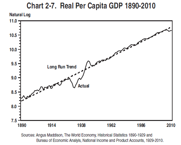 Some international economic organizations have argued that a financial recession permanently scars an economy, and this view is also shared by some American forecasters. On that view, there is no reason to expect a full recovery to the previous trend of real GDP. The statistical evidence for permanent scarring comes mostly from the experiences of developing countries and its relevance to the current situation in the United States is debatable. Historically, economic growth in the United States economy has shown considerable stability over time as displayed in Chart 2-7. Since the late 19th century, following every recession, the economy has returned to the long-term trend in per capita real GDP. This was true even following the only previous recession in which the United States experienced a disastrous financial crisis – 1929-1933 – although the recovery from the Great Depression was not complete until World War II restored demand. The U.S. economy has enormous room for growth, although there are factors that could continue to limit that growth in the years ahead.Ok, except for that silly bit about how great WWII was, (almost echoing Paul Krugman's idea that the key to prosperity is for the government to fake an alien invasion) we seem agreed.