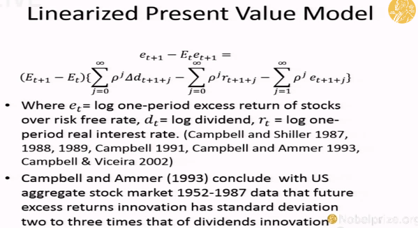 At 1:23, he described the Campbell-Ammer variance decomposition, concluding "only about a half or a third of the fluctuations in the stock market could be explained by evidence about future dividends," and concluding, "so most of the market doesn’t make sense"