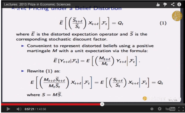 In the first equation S with a tilde on it represents marginal utility, consumption to the gamma power in the usual formulation, X represents an asset payoff, and Q is then the price. This is the standard present value formula -- except Lars wants to think about E as a "distorted" expectation. Following the usual theorems, in the bottom equation we can represent the same idea with the real expectation and an extra M term multiplying the stochastic discount factor. (Yes, everyone else uses M for Lars' S, and P for his Q.) This is essentially the risk neutral valuation trick, that we can introduce a new "discount factor" M to represent the probability "twist."