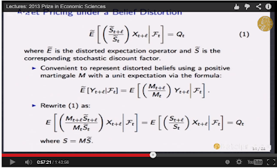 Lars chose to talk more about his current research and less about the research that got him the prize, a good technique for these lectures. He's working on "ambiguity," how to handle the fact that we don't really know what the right model is, and, even more interestingly, how to construct models in which the people in the models don't really know what the right model is. Typically for Lars, this is a very deep research program, which may lead to a fundamental difference in how we think about risk and information in economics.