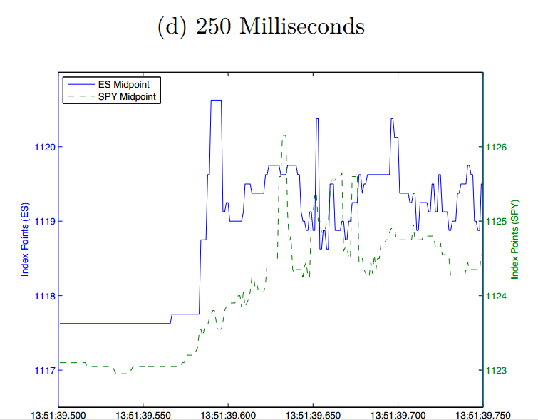 16. This article and the paper it quotes show a great deal of misunderstanding of how markets work. The reason there are these arbitrage opportunities is because a buyer will just buy E-minis (for convenience, because he has a short position in E-minis and wants to close it) and not the SPY. Arbitrageurs see the opportunity and react, moving the SPY in line with the E-mini. And things will always happen in this order. In a continuous market, the SPY will move 10 ms later, in a 1 sec batch market, it will happen the next second at the next batch, you will never have perfect correlation, in fact, the proposed "solution" will make it worse! By t he way, it is probably one of those arbitrageurs who sold some of the E-minis to the buyer, enhancing the size and price on the offer, knowing that he could hedge himself at a small profit on the SPY, in effect knitting markets together (he is displaying liquidity coming from the SPY on the E-mini book). This guy will probably not be there in a batch auction market if he is not "sure" he can hedge himself reasonably well and within a short period of time, making the liquidity worse. By the way, one would also need to make ALL (futures, fx, bonds, european) markets batched and perfectly synchronized.