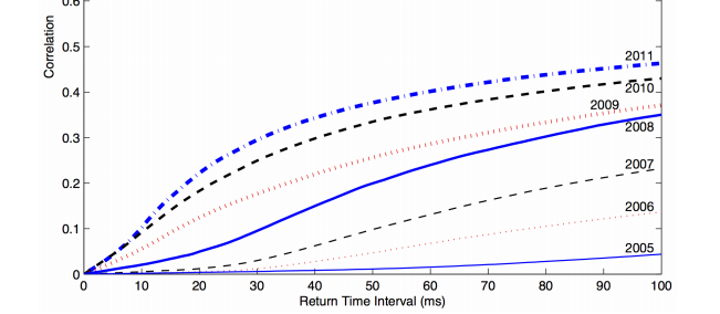 How has high frequency trading affected the market? On the left, they plot correlation as a function of time interval over time. In 2005, the correlation of price changes was still zero at 100 ms. By 2011, 100ms price changes rose to 0.5 correlation, and the correlation stayed pretty good down to 40 ms.  The boundary of high correlation got shorter and shorter.