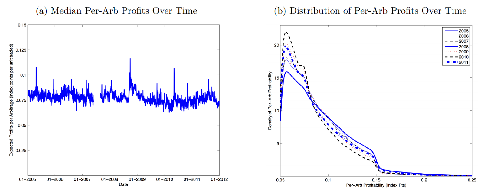 These are the profits per opportunity, essentially a measure of how wide the price spreads are independently of how long they last. The price dispersion seems to be the same as ever, it just goes away much more quickly than it used to.