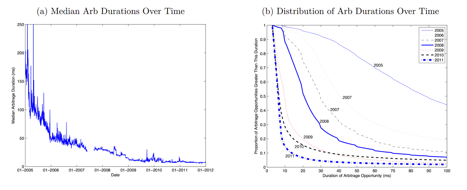 Next, they calculate potential arbitrage opportunities: times when the price difference exceeds the bid-ask spread. They also calculate how long those opportunities last. As you can see below, the effect of high frequency trading has been to dramatically reduce the duration of arbitrage opportunities. Once the prices diverge by more than the bid-ask spread, in 2005 that divergence could last 100 ms. Now, that divergence seldom lasts more than 10 ms.