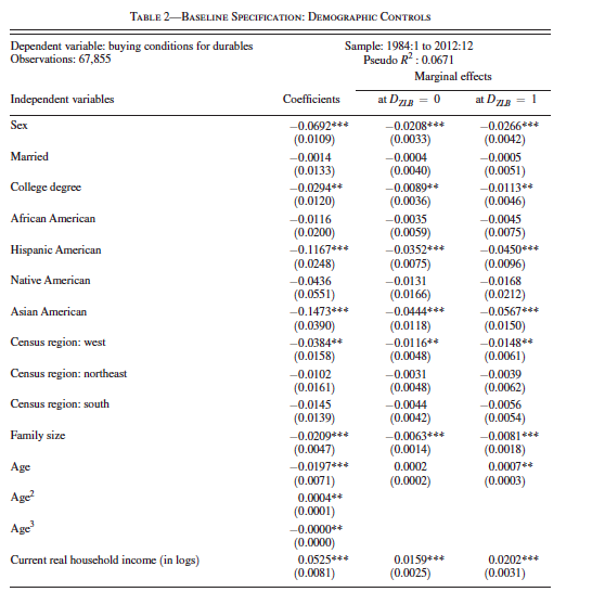With respect to the coefficients on the economic control variables, we obtain for the most part plausible and significant estimates,... the expected financial situation of the household and its real income, the expected business conditions (idiosyncratic and aggregate), the current financial situation, and the current real household income all have significantly positive effects on the reported spending readiness. In addition, a positive judgement of US economic policy also affects spending dispositions positively. Moreover, an expected increase in future nominal interest rates makes people want to spend more today, while higher economic uncertainty in the form of stock market volatility, inflation volatility and higher unemployment rates (both current and expected) decrease the probability that people find buying conditions favorable ...But enough whining. My point is that micro, regression-based analysis has its limitations too. This seemed like a good example on which to remind graduate student readers of common regression pitfalls: Always ask what caused the variation in the right hand variable. Use minimal controls, not the kitchen sink. Make sure the partial effects of your regression (move x holding z constant) make sense. And so on.