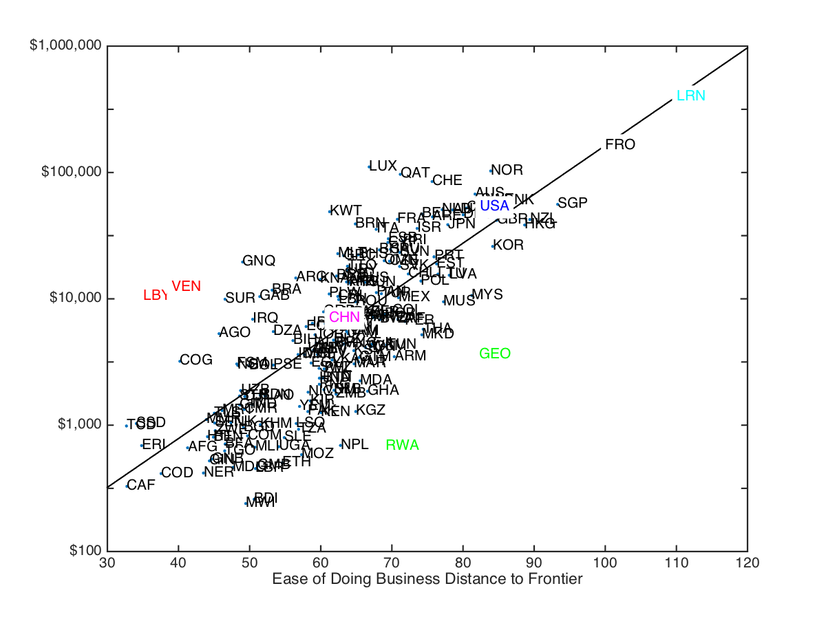 The correlation would be stronger if not for the outliers. In red, Libya and Venezuela are arguably countries with temporarily higher GDP than the quality of their institutions will allow for long. In green, Rwanda and Georgia may have reasons for temporarily low GDP among improving institutions. Cuba and North Korea are missing. Luxembourg, Kuwait, have obvious stories. And I did not weight by population; large countries seem to be closer to the line.