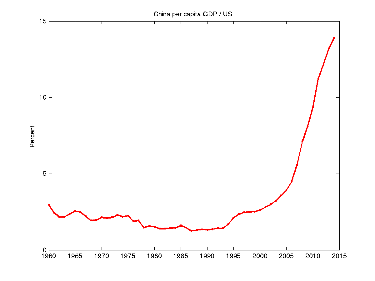 China removed exactly the sort of "level" or "inefficiency" economic distortions that free-market economists like myself (and Adam Smith) recommend. What happened? Here is a plot of China's per capita GDP, relative to the US (From World Bank). In case you've been sleeping under a rock somewhere, China took off.