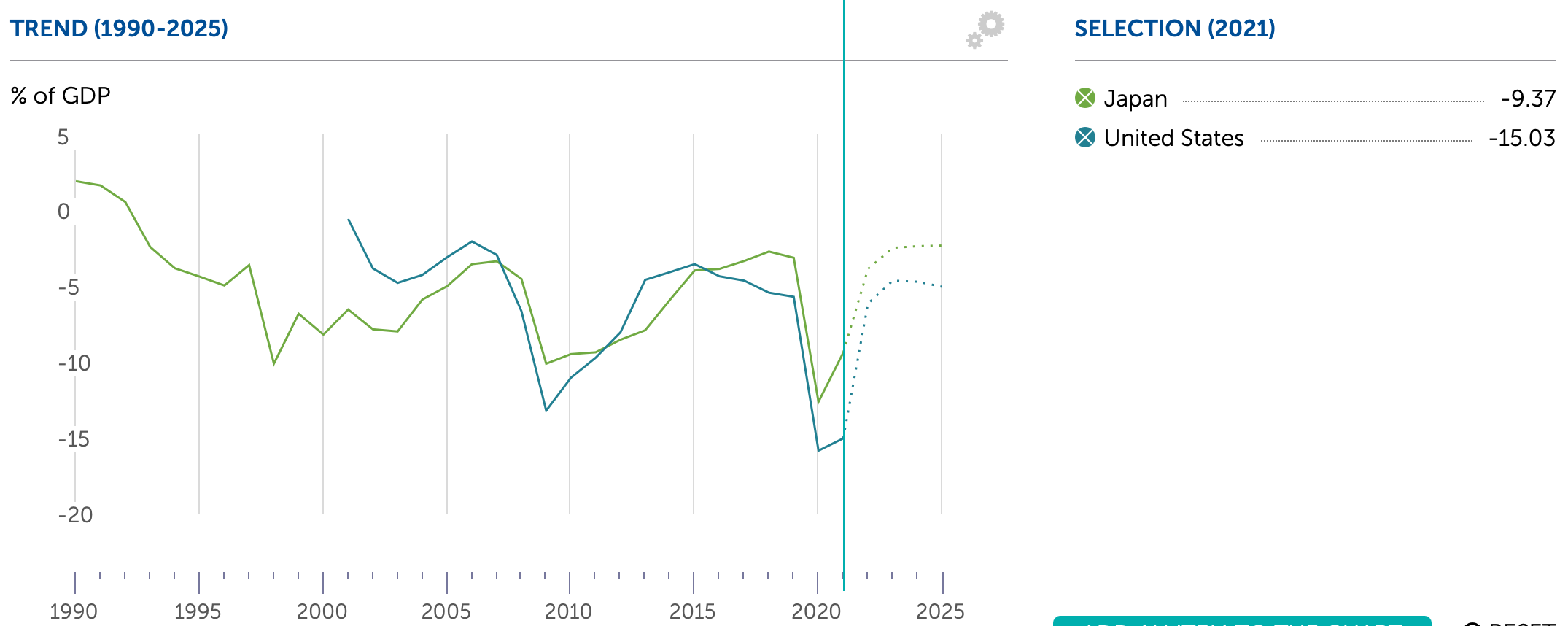 It was not always thus. Japan started borrowing heavily in the 1990s from a debt/GDP ratio of 63%. (For some reason the IMF does not have US data before 2002.)