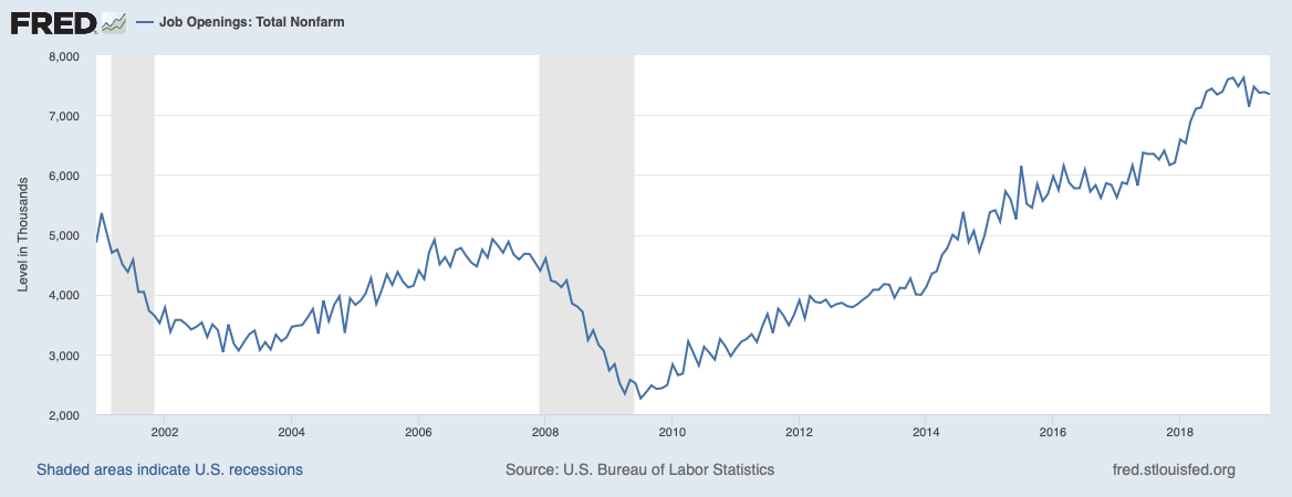 The unemployment rate is 3.9%, lower than it has ever been in a half century. It fell faster after about 2014 than in the last two recessions.
