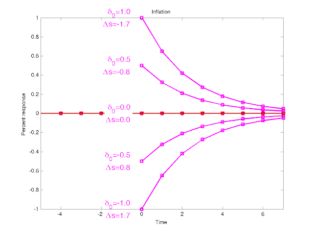 Use the standard "new-Keynesian" model \[ x_{t} = E_{t}x_{t+1}-\sigma(i_{t}-E_{t}\pi_{t+1}) \] \[ \pi_{t} = \beta E_{t}\pi_{t+1}+\kappa x_{t} \] Add a Taylor rule, and suppose the Fed follows an inflation-target shock with no interest rate change \[ i_t = i^\ast_t + \phi_\pi ( \pi_t - \pi^\ast_t). \] \[ i^\ast_t = 0 \] \[ \pi^\ast_t = \delta_0 \lambda_1^{-t} \] Equivalently express the Taylor rule with a ``Wicksellian'' shock, \[ i_t = \hat{i}_t + \phi_\pi \pi_t \] \[ \hat{i}_t = - \delta_0 \phi_\pi \lambda_1^{-t}. \] In both cases, \[ \lambda_{1} =\frac{\left( 1+\beta+\kappa\sigma\right) +\sqrt{\left( 1+\beta+\kappa\sigma\right) ^{2}-4\beta}}{2} \gt 1 \] Yes, this is a special case. The persistence of the shocks is just equal to one of the roots of the model. Here \(\delta_0\) is just a parameter describing how big the monetary policy shock is.